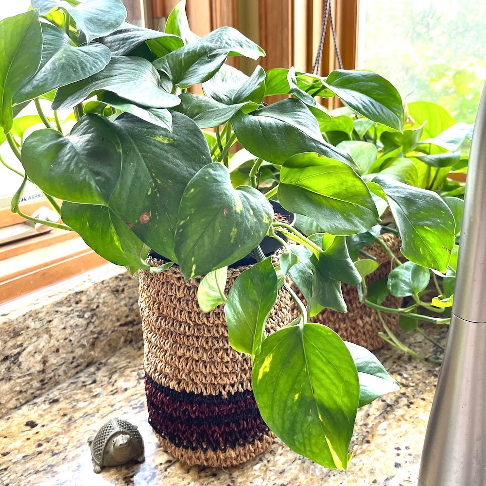 This versatile basket is ideal for kitchen countertops, and small spaces to provide beautiful upright storage for utensils. Use it as a decorative vase for those house plants in water. This holder, made from banana fibers and hand-crocheted, adds natural texture and warmth to any space.